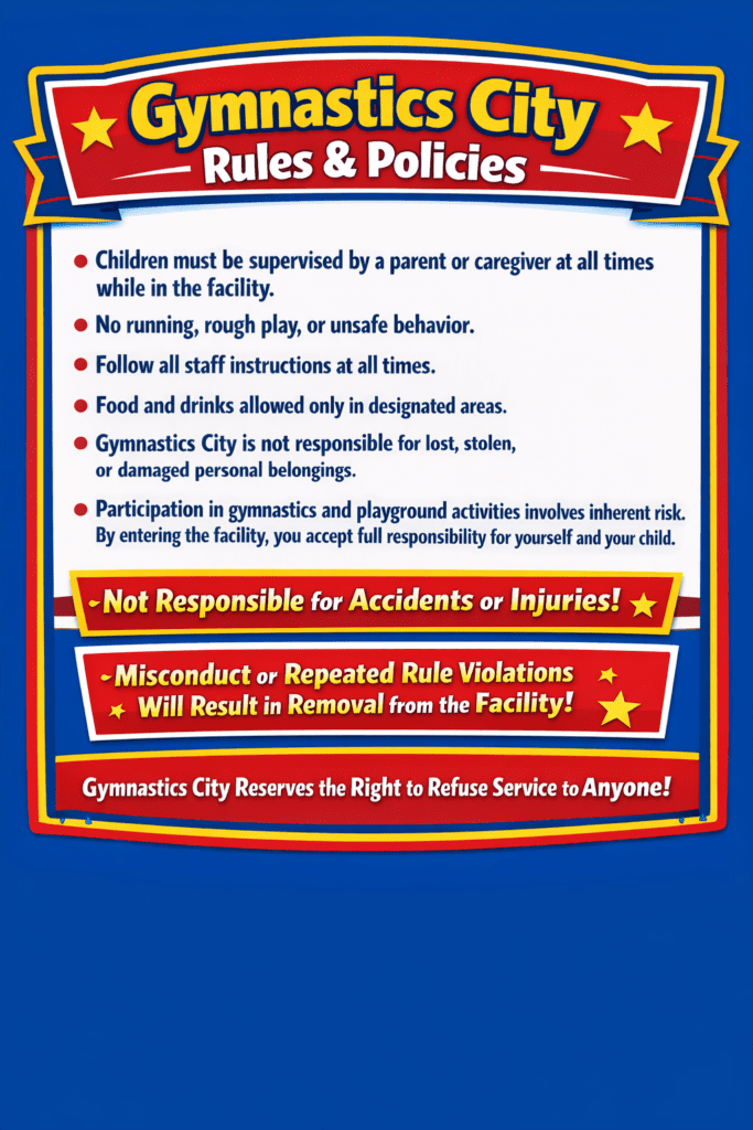 We appreciate your cooperation in helping us keep Gymnastics City a safe and enjoyable environment for everyone.